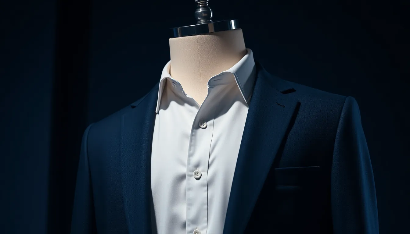 ネイビーの感動ジャケットとパンツを。店員さんに「指一本分の余裕」を確認してもらい、裾上げも妥協しません。